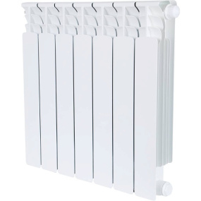 секционный, материал: биметаллические, подключение: нижнее правое, межосевое расстояние 50 см, число секций: 7, диаметр подключения: 1 дюйм, ширина одной секции 8 см, макс. рабочее давление 20 бар, литье под давлением, глянцевое покрытие, макс. рабочая температура 135°C