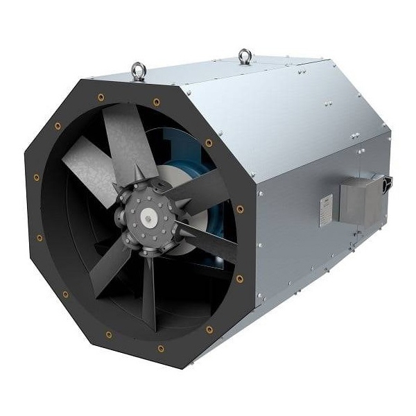 осевой вентилятор, максимальный расход воздуха 24 400 куб. м/ч, максимальный располагаемый напор 1 470 Па, взрывозащищенный, присоединительный размер 560 мм, материал корпуса: сталь, монтаж: в воздуховод